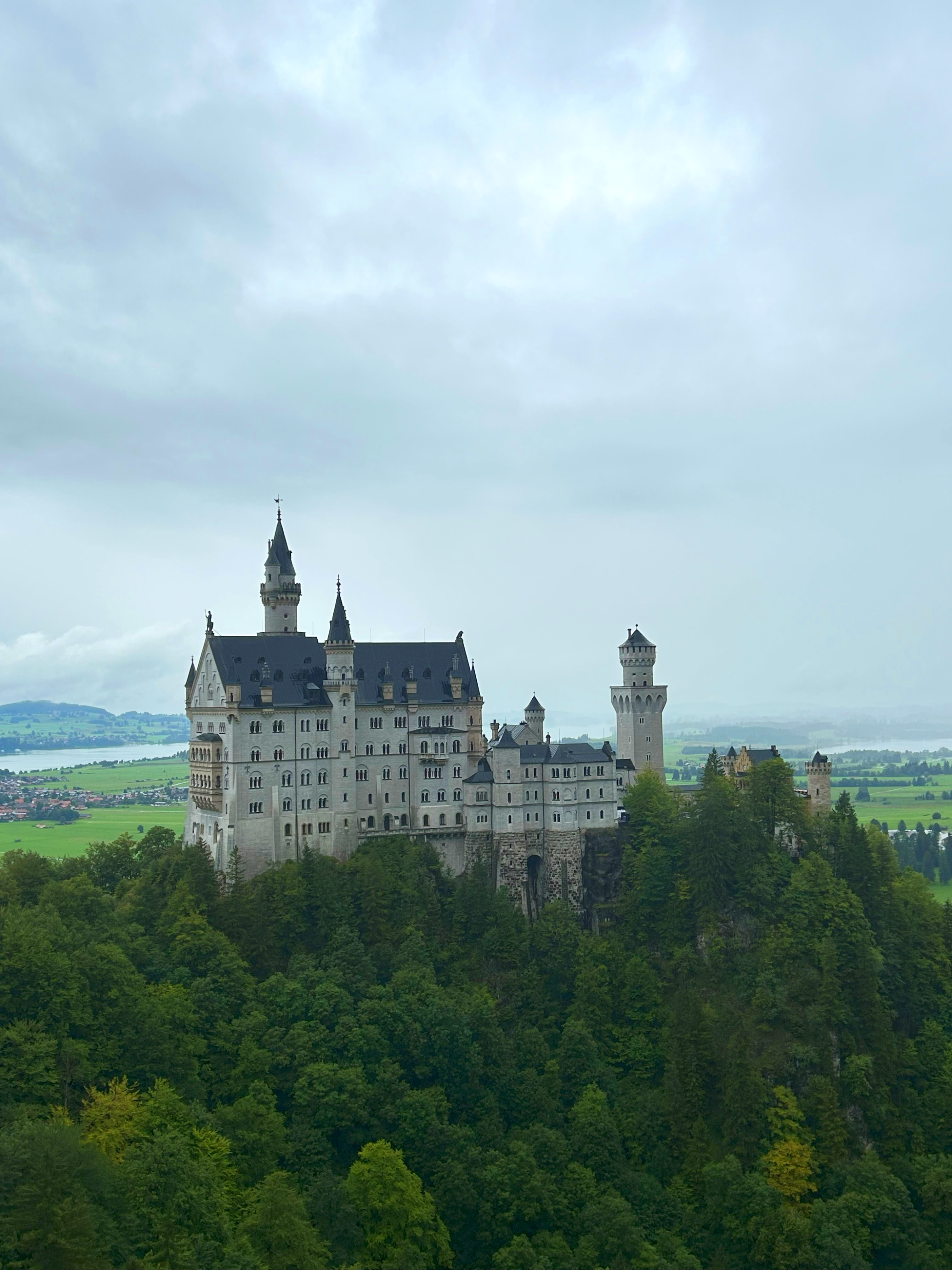 en annan värld. Inne i slottet möts vi av överdådiga salar dekorerade med detaljerade fresker och konstverk som berättar historier om gamla legender och kung Ludwig II:s drömmar. Varje rum är som ett konstverk, där varje detalj speglar den romantiska visionen om en medeltida riddarborg. Utanför väntar panoramavyer över de omgivande bergen och den glittrande sjön Alpsee, som tillsammans skapar en miljö som känns både mäktig och drömlik.